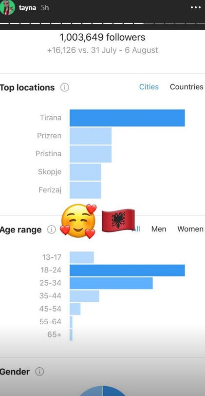 Ajo ka publikuar statistikat demografike të mbledhura nga Instagrami,e cila dëshmon se numrin më të madh të fansave dhe numri më i madh i njerëzve që kanë vizituar profilin e saj vjen nga Tirana.