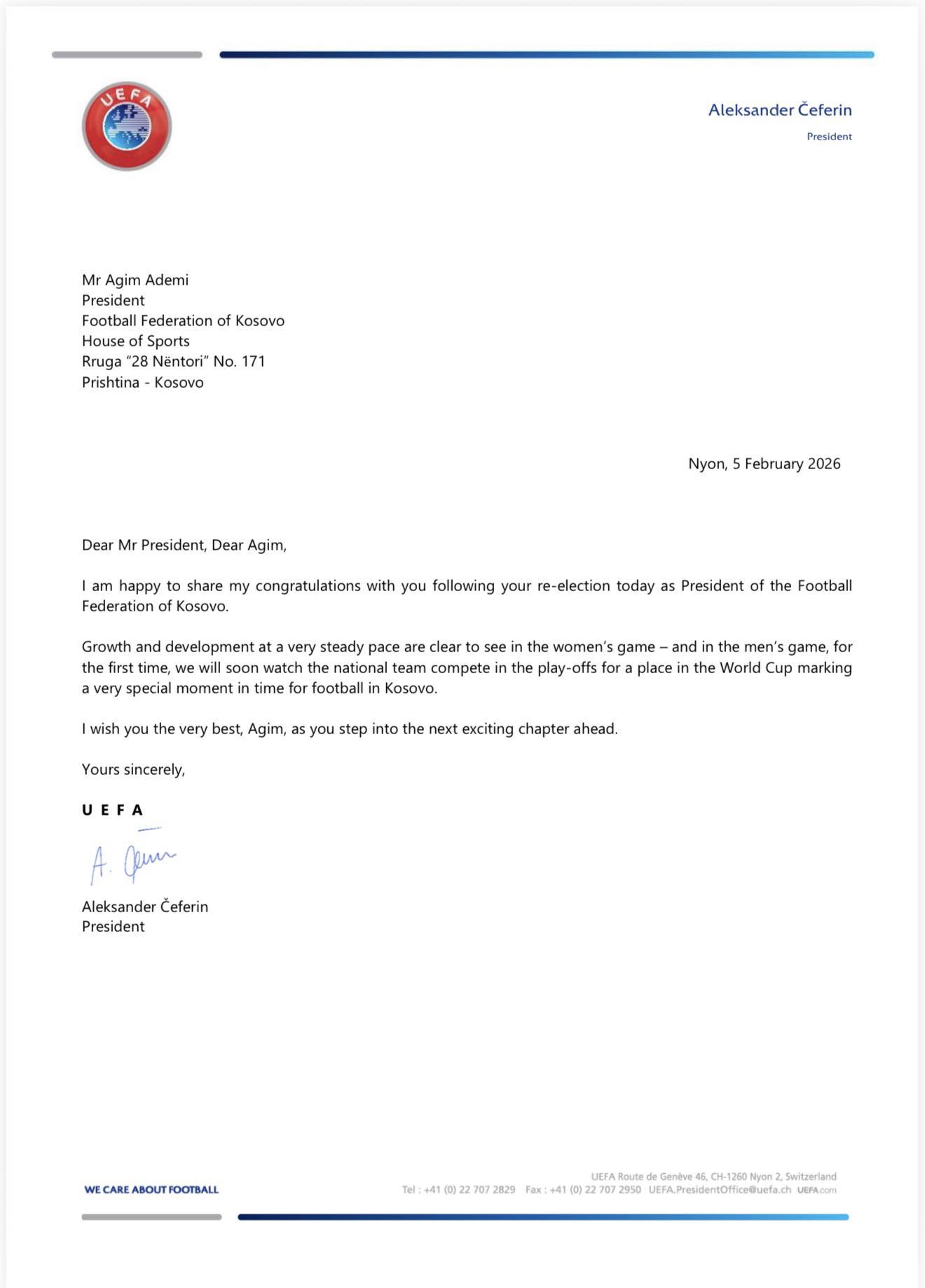 Edhe presidenti i UEFA-s, Aleksander Çeferin ka uruar presidentin Agim Ademi për rizgjedhjen në krye të FFK-së. Ai ka vlerësuar progresin e futbollit kosovar si dhe momentin historik të Kombëtares së Kosovës. Pak më parë, Federata publikoi edhe letrën e presidentit të FIFA-s, drejtuar Ademit për mandatin e tij të tretë.