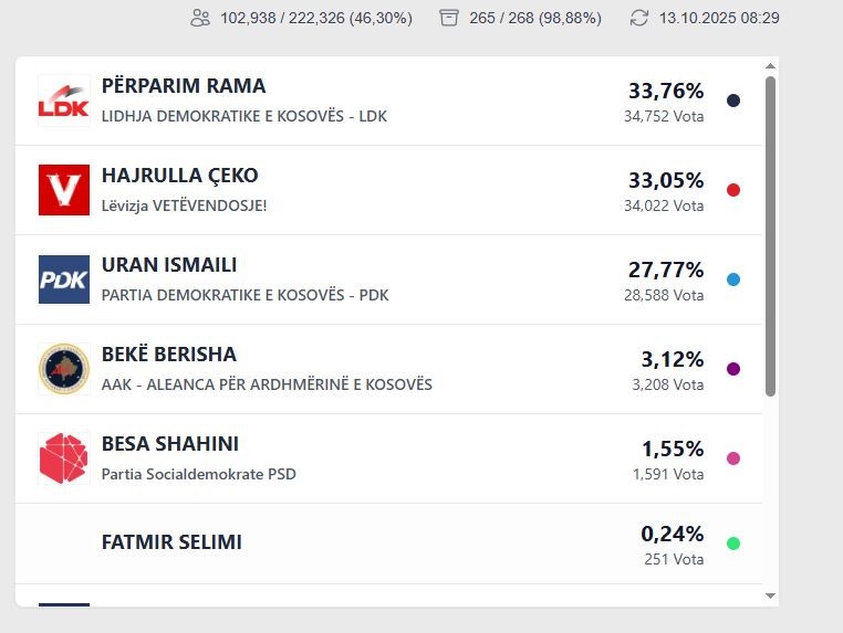 Bazuar në të dhënat e KQZ-së, deri më tani vendin e parë e zë Përparim Rama nga LDK, me 34 mijë e 752 vota, apo 33.76%.