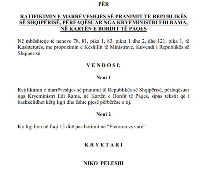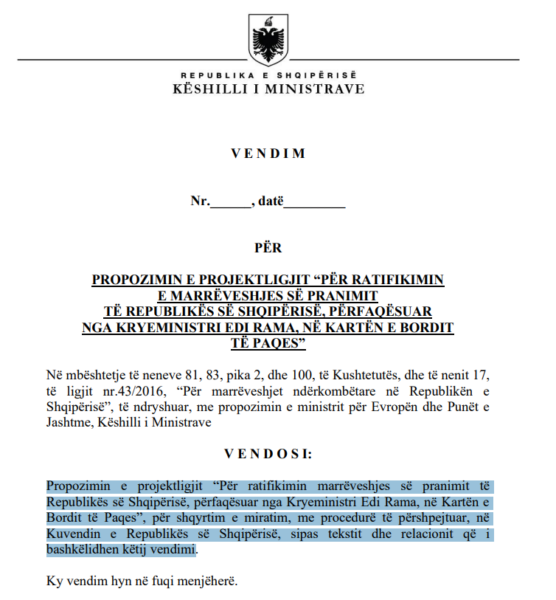 Sipas vendimit të qeverisë, marrëveshja do të ratifikohet me përfaqësimin e Kryeministrit Edi Rama.