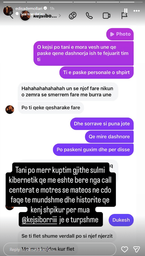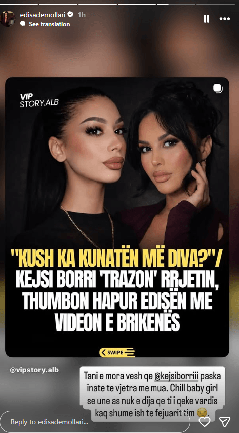 Ish-banorja e Big Brother VIP Albania, Edisa Demollari, ka publikuar në Instagram një bisedë private me Kejsi Borrin, motrën e banorit Mateo Borri, duke e kthyer një gjë personale në një debat publik.