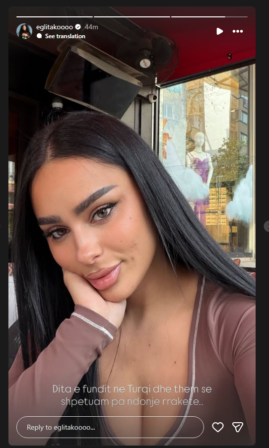Këngëtarja Egli Tako ka ndarë momentin e fundit të qëndrimit të saj në Turqi përmes një Instastory, duke treguar lehtësimin pas një udhëtimi në një vend të prekur nga tensionet e luftës.