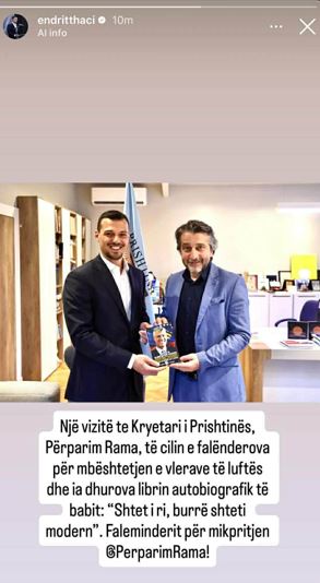 “Një vizitë te Kryetari i Prishtinës, Përparim Rama, të cilin e falënderova për mbështetjen e vlerave të luftës dhe ia dhurova librin autobiografik të babit: ‘Shteti i ri, burrë shteti modern’. Faleminderit për mikpritjen @PerparimRama1”, thuhet në shkrimin e publikuar.