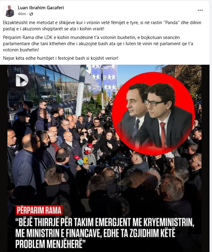 “Ekzaktësisht me metodat e shkijeve kur i vrisnin vetë fëmijët e tyre, si në rastin “Panda” dhe dilnin pastaj e i akuzonin shqiptarët se ata i kishin vrarë! Përparim Rama dhe LDK e kishin mundësinë t’a votonin buxhetin, e bojkotuan seancën parlamentare dhe tani kthehen dhe i akuzojnë bash ata qe i luten të vinin në parlament qe t’a votonin buxhetin!”, ka shkruar Gacaferi.