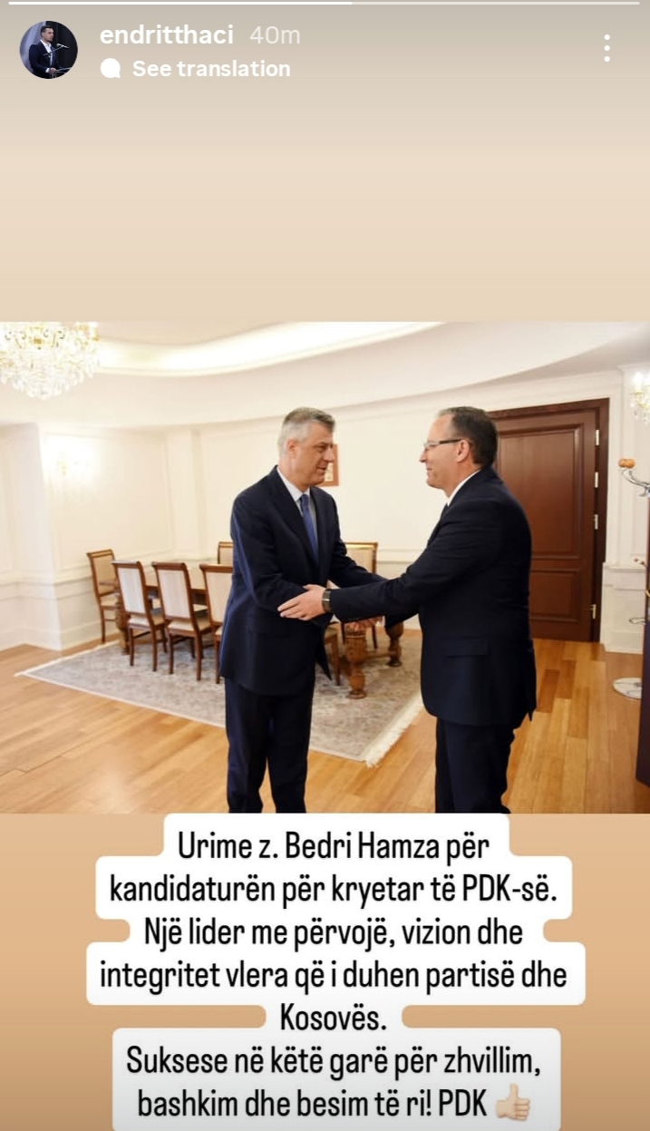 “Urime, zoti Bedri Hamza, për kandidaturën për kryetar të PDK-së. Një lider me përvojë, vizion dhe integritet, vlera që i duhen partisë dhe Kosovës”, ka shkruar Endrit Thaçi në një postim në Instagram.
