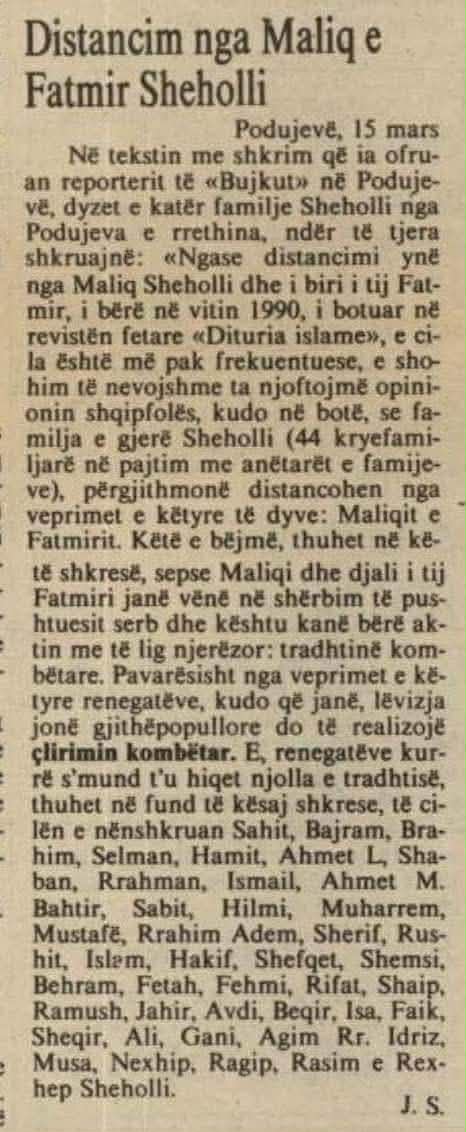 “Ngase distancimi ynë nga Maliq Sheholli dhe i biri i tij Fatmir, i bërë në vitin 1990, botuar në revistën fetare ‘Dituria islame’, e cila është më pak frekuentuese, e shohim të nevojshme ta njoftojmë opinionin shqipfolës, kudo në botë, se familja e gjerë Sheholli (44 kryefamiljarë në pajtim me anëtarët e familjeve), përgjithmonë distancohet nga veprimet e këtyre të dyve: Maliqit e Fatmirit. Këtë e bëjmë, thuhet në këtë shkresë, sepse Maliqi dhe djali i tij Fatmiri janë vënë në shërbim të pushtuesit serb dhe kështu kanë bërë aktin më të lig njerëzor: tradhtinë kombëtare. Pavarësisht nga veprimet e këtyre renegatëve, kudo që janë, lëvizja jonë gjithëpopullore do të realizojë çlirimin kombëtar. E, renegatëve kurrë s’mund t’u hiqet njolla e tradhtisë,” thuhet në fund të kësaj shkrese, të cilën e nënshkruan Sahit, Bajram, Brahim, Selman, Hamit, Ahmet L, Shaban, Rrahman, Ismail, Ahmet M, Bahtir, Sabit, Hilmi, Muharrem, Mustafë, Rrahim Adem, Sherif, Rushit, Islëm, Hakif, Shefqet, Shemsi, Behram, Fetah, Fehmi, Rifat, Shaip, Ramush, Jahir, Avdi, Beqir, Isa, Faik, Sheqir, Ali, Gani, Agim Rr, Fitim, Musa, Nexhip, Ragip, Rasim e Rexhep Sheholli”, thuhej në një tekst të këtyre banorëve drejtuar gazetës “Bujku”.