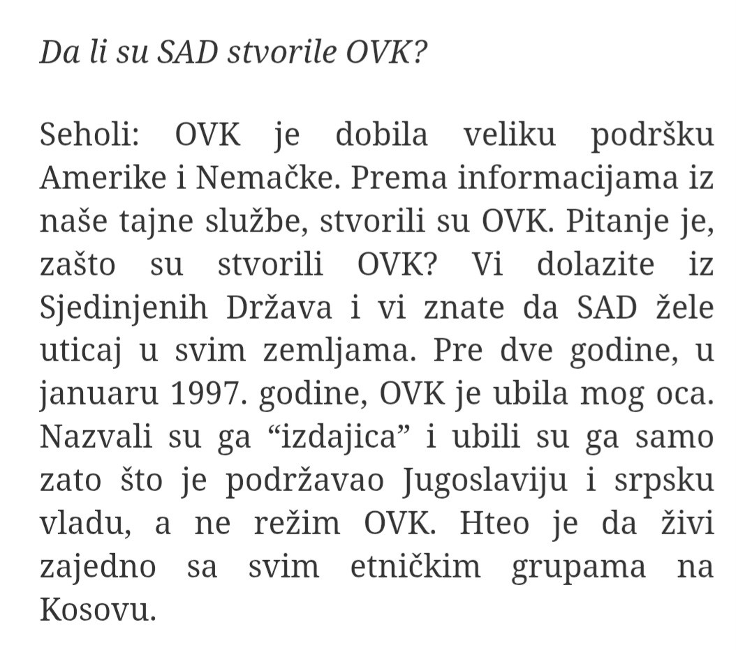 “Sipas informacioneve të shërbimeve tona sekrete, ata e kanë krijuar UÇK-në. Pyetja që shtrohet është: pse e krijuan UÇK-në? Ju vini nga Shtetet e Bashkuara dhe e dini mirë se SHBA-të synojnë të kenë ndikim në të gjitha vendet. Dy vjet më parë, në janar të vitit 1997, UÇK-ja vrau babain tim. E quajtën “tradhtar” dhe e ekzekutuan vetëm sepse ai mbështeste Jugosllavinë dhe qeverinë serbe, e jo regjimin e UÇK-së. Ai dëshironte të jetonte në paqe, së bashku me të gjitha grupet etnike në Kosovë”, kishte deklaruar Sheholli.