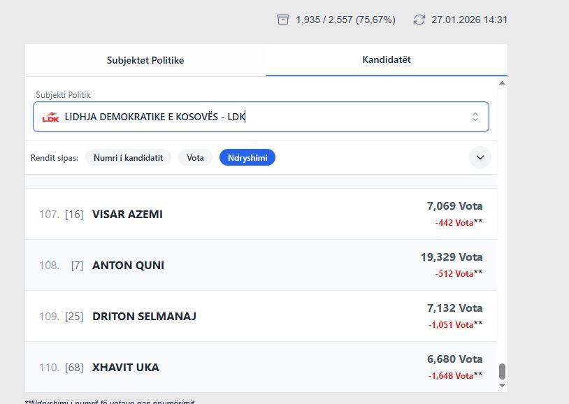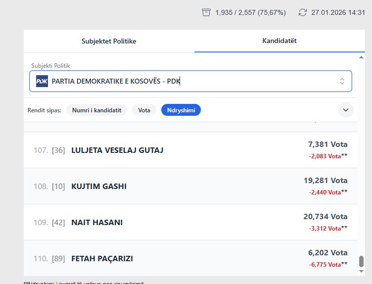 E padyshim se rekordin për këtë tani për tani e mban kandidati i PDK-së, Fetah Pacarizi me -6775 vota, nga 6202 vota sa i figuronin në fillim.