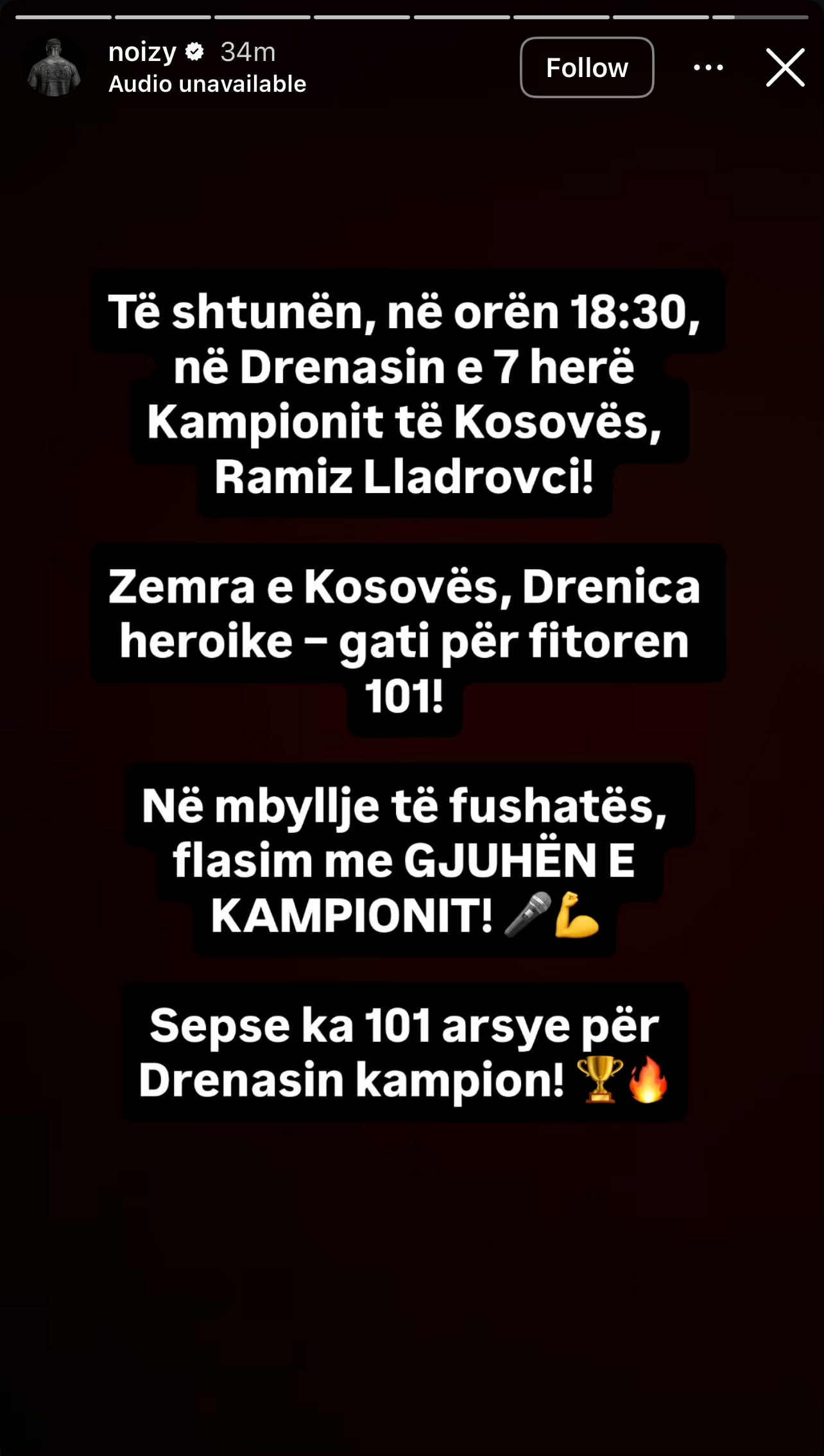“Të shtunën, në orën 18:30, në Drenasin e 7 herë Kampionit te Kosovës, Ramiz Lladrovci! Zemra e Kosovës, Drenica heroike – gati për fitoren 101! Në mbyllje të fushatës, flasim me GJUHËN E KAMPIONIT!. Sepse ka 101 arsye për Drenasin kampion”, ka shkrua Noizy./Lajmi.net/