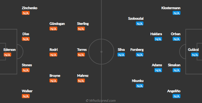 RB Leipzig (4-2-3-1): Gulacsi; Klostermann, Orban, Simakan, Angelino; Haidara, Adams; Szoboszlai, Forsberg, Nkunku; Silva