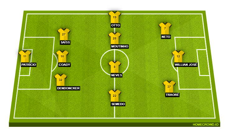 Wolves (3-4-3): Patricio; Dendoncker, Coady, Saiss; Semedo, Neves, Moutinho, Jonny; Traore, Willian Jose, Neto