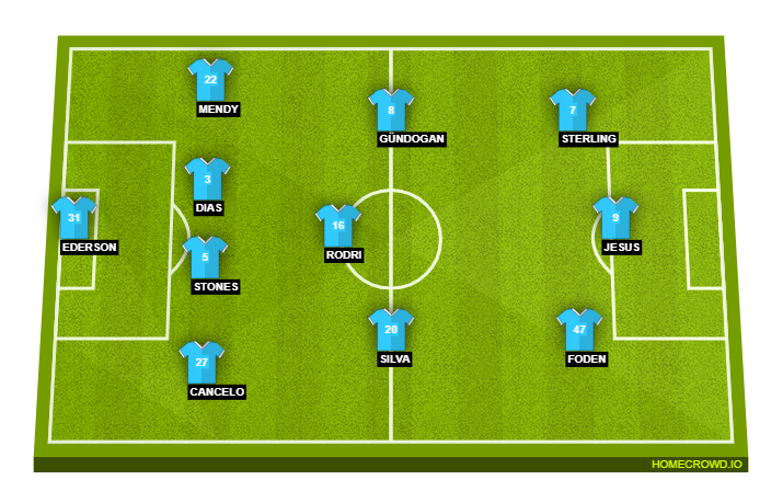 Manchester City (4-3-3): Ederson; Cancelo, Stones, Dias, Mendy; Silva, Rodri, Gundogan; Foden, Jesus, Sterling