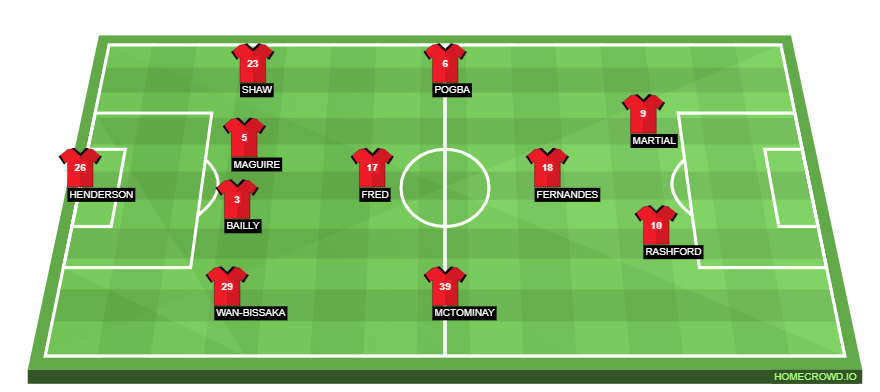 United (4-3-1-2): Henderson; Shaw, Maguire, Bailly, Wan-Bissaka; Fred, Pogba, McTominay; Fernandes; Rashford, Martial.