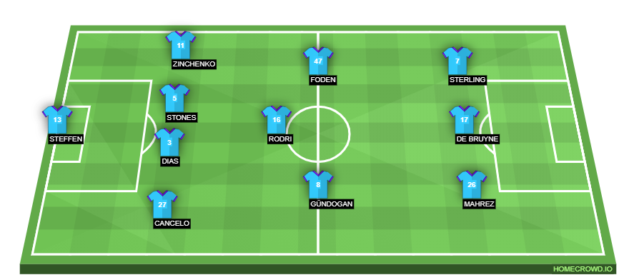 City (4-3-3): Steffen; Zichenko, Stones, Dias, Cancelo; Foden, Rodri, Gundongan; Sterling, Mahrez, De Bruyne.