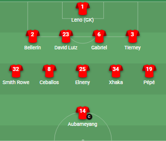 Arsenal: Leno; Bellerin, Luiz, Gabriel, Tierney; Rowe, Ceballos, Elneny, Xhaka, Pepe; Aubameyang.