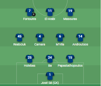 Olympiacos Piraeus: Jose; Sokratis, Ba, Holebas; Androutsos, M’Vlla, Camara, Reabcluk; Masouras, El-Arabi, Fourtounis.