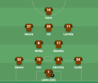 Tottenham: Loris; Aurier, Sánchez, Dier, Davies; Sissoko, Winks; Lamela, Alli, Lucas Moura; Kane