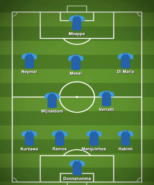 Donnarumma; Hakimi, Marquinhos, Ramos, Kurzawa; Verratti, Wijnaldum; Di Maria, Neymar, Messi, Mbappe.