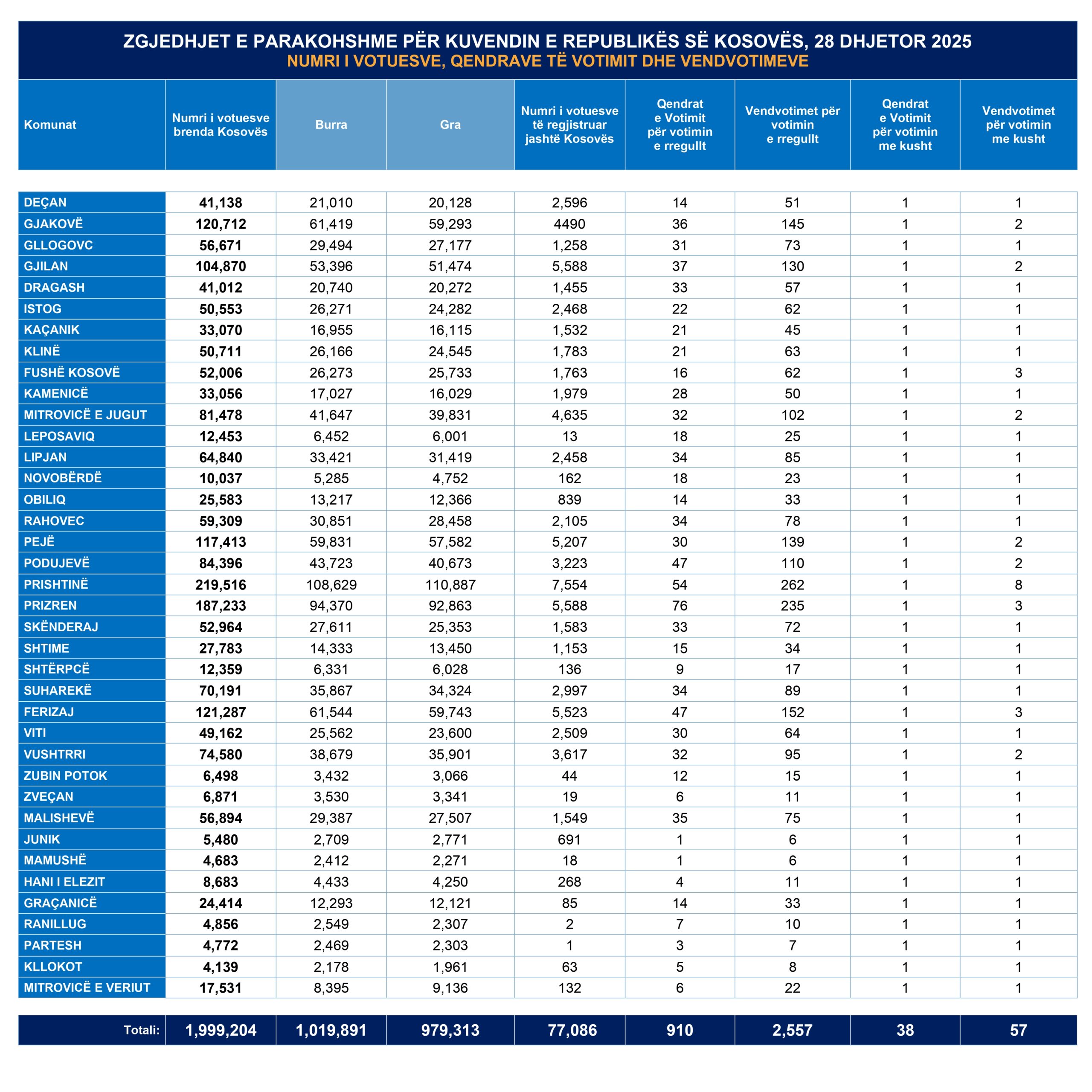 Komuna e Prishtinës kryeson me numrin më të madh të votuesve, mbi 219 mijë, e ndjekur nga Prizreni me mbi 187 mijë votues.