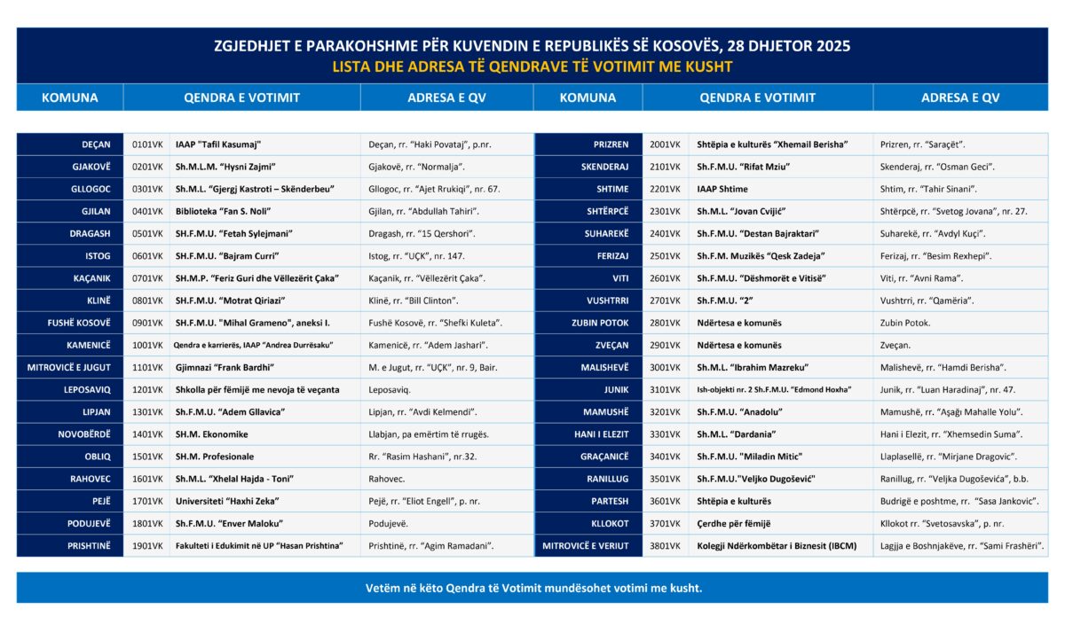 Ndërkaq, votimi me kusht do të mundësohet në 38 qendra të veçanta, me 57 vendvotime, nga një qendër për secilën komunë.