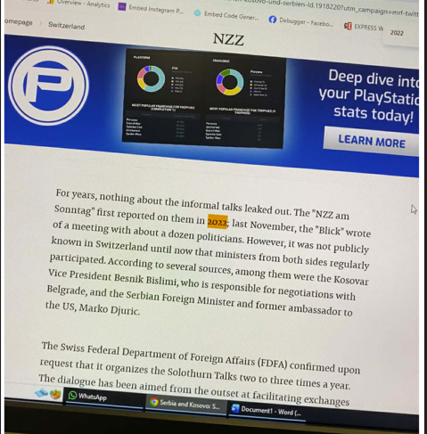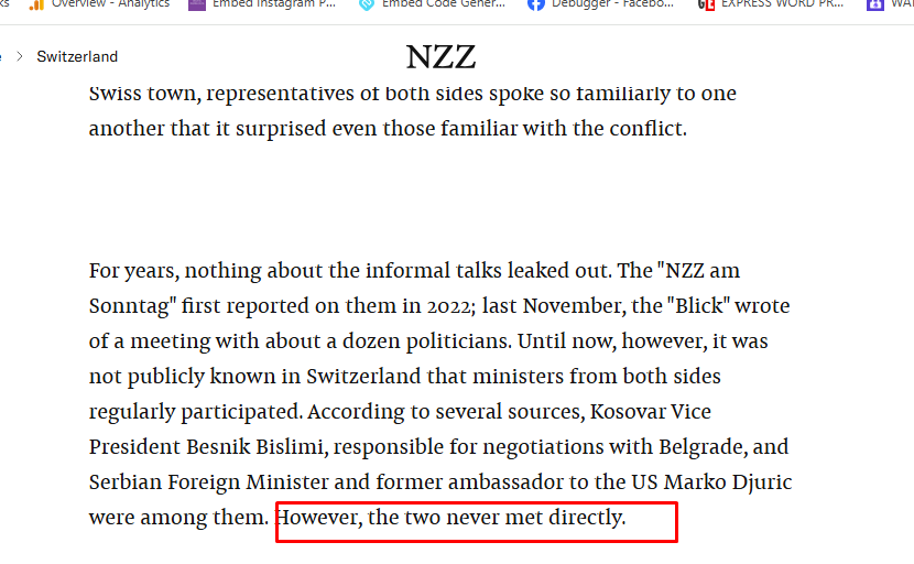 Gazeta zvicerane “NZZ”, e ka përditësuar publikimin e djeshëm për takimet “sekrete” në Solothurn të Zvicrës, duke thënë se ndonëse Besnik Bislimi e Marko Gjuriq kanë qenë pjesëmarrës, ata s’janë takuar direkt mes vete. Për dallim nga raportimi i djeshëm, sot “NZZ” shkroi saktësisht se Bislmi e GJuriq “megjithatë nuk janë takuar kurrë mes vete”.…