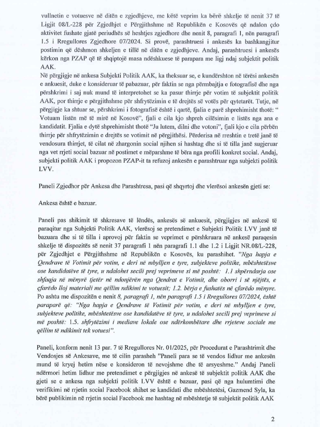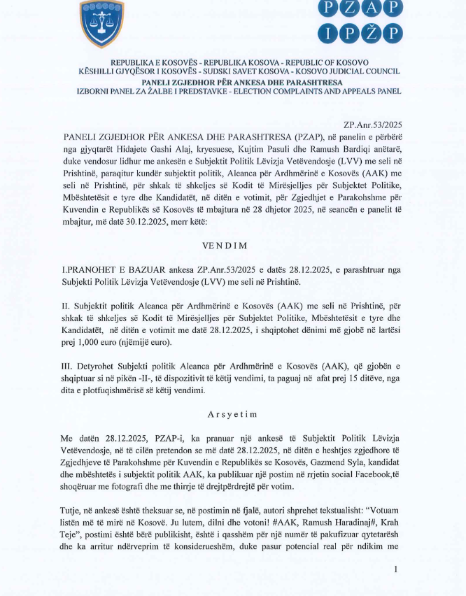 Për këtë arsye, PZAP e ka marrë si të bazuar ankesën e VV-së duke e gjobitur me 1 mijë euro subjektin politik, nga i cili vje Syla, AAK-në. /Lajmi.net/