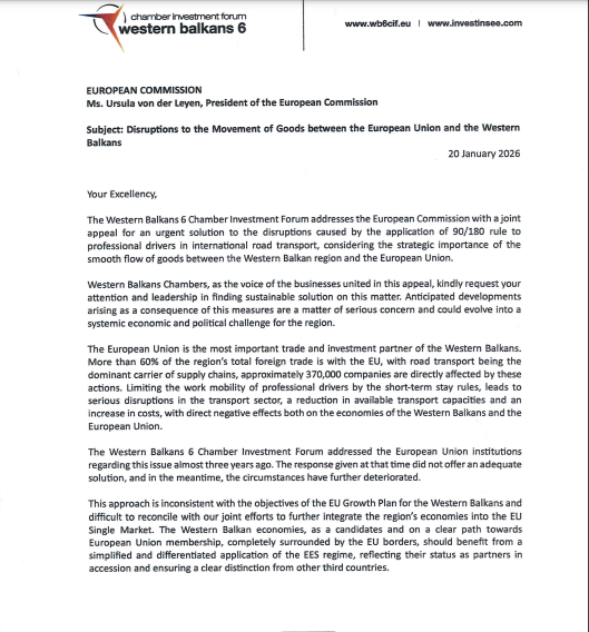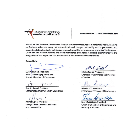 “Dhoma e Tregtisë së Ballkanit Perëndimorë është zë i bizneseve të bashkaur në këtë çështje, me kërkesë të sinqertë për vëmendjen tuaj, për të gjetur zgjidhje substanciale në këtë çështje”.