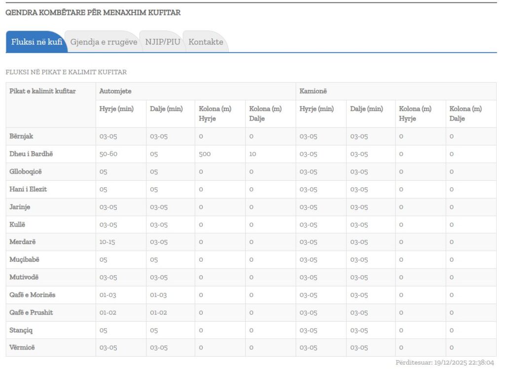 Sipas të dhënave të Qendrës Kombëtare për Menaxhim Kufitar, pritjet më të gjata vijojnë te Dheu i Bardhë, deri në 50-60 minuta për të hyrë në Kosovë, derisa për të dalë deri në 5 minutë.