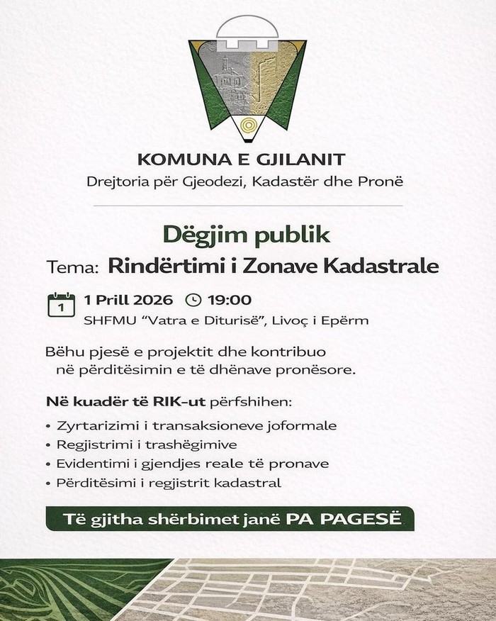 Nga Komuna e Gjilanit u bëhet thirrje qytetarëve që të marrin pjesë në takimet informuese, me qëllim që të informohen dhe të kontribuojnë në sigurimin dhe saktësimin e pronave të tyre.