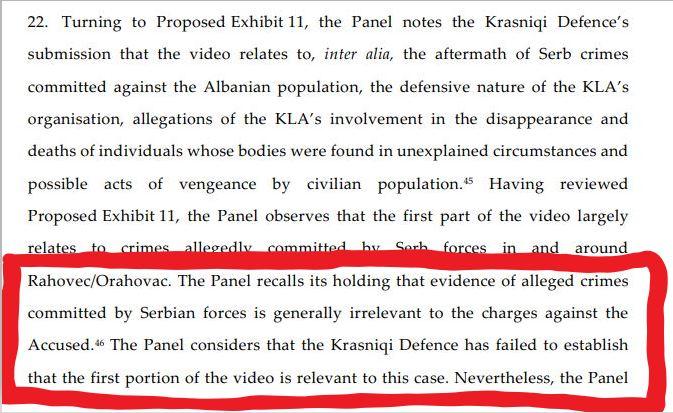 “Duke iu kthyer Provës së Propozuar 11, Paneli vëren pretendimin e Mbrojtjes së Krasniqit se videoja lidhet, ndër të tjera, me pasojat e krimeve serbe të kryera kundër popullsisë shqiptare, natyrën mbrojtëse të organizatës së UÇK-së, pretendimet për përfshirjen e UÇK-së në zhdukjen dhe vdekjen e individëve, trupat e të cilëve u gjetën në rrethana të pashpjegueshme dhe aktet e mundshme të hakmarrjes nga popullsia civile. Pasi shqyrtoi Provën e Propozuar 11, Paneli vëren se pjesa e parë e videos lidhet kryesisht me krimet që dyshohet se janë kryer nga forcat serbe në Rahovec dhe përreth. Paneli kujton qëndrimin e tij se provat e krimeve të dyshuara të kryera nga forcat serbe janë përgjithësisht të parëndësishme për akuzat kundër të Akuzuarit. Paneli konsideron se Mbrojtja e Krasniqit nuk ka arritur të vërtetojë se pjesa e parë e videos është relevante për këtë çështje”, thuhet në këtë vendim.