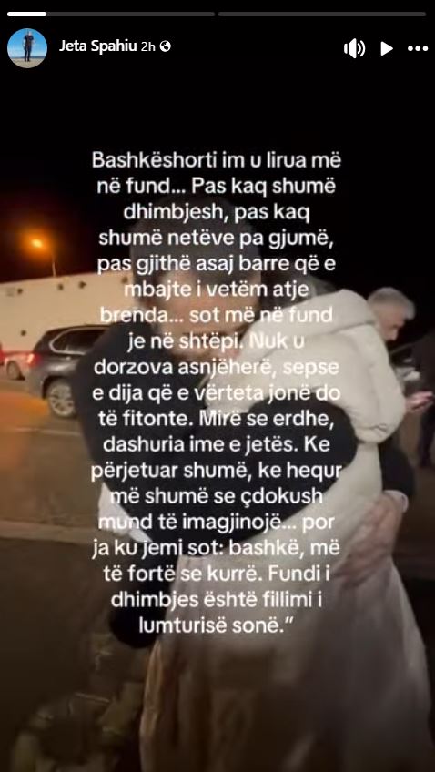 “Bashkëshorti im u lirua më në fund. Pas kaq shumë dhimbjesh, netëve pa gjumë dhe barrës që e mbajte i vetëm atje brenda… sot je në shtëpi. Nuk u dorëzove asnjëherë, sepse e dija që e vërteta jonë do fitonte. Mirë se erdhe, dashuria ime. Ke përjetuar shumë dhe ke duruar më shumë se kushdo mund ta imagjinojë, por ja ku jemi sot: bashkë, më të fortë se kurrë. Fundi i dhimbjes është fillimi i lumturisë sonë”, shkroi Jeta Spahiu në Facebook./lajmi.net/
