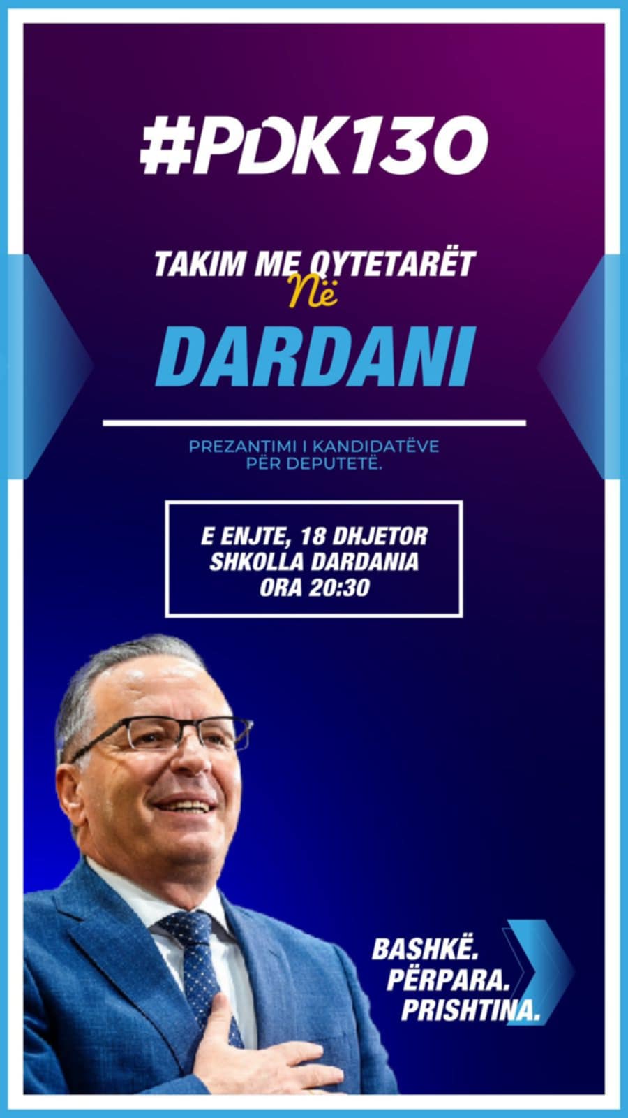 Hamza do të prezantojë kandidatët e PDK-së për deputetë në një takim me qytetarët që do të mbahet në shkollën fillore “Dardania”, në lagjen Dardania. Tubimi është paralajmëruar të fillojë në orën 20:30, raporton lajmi.net