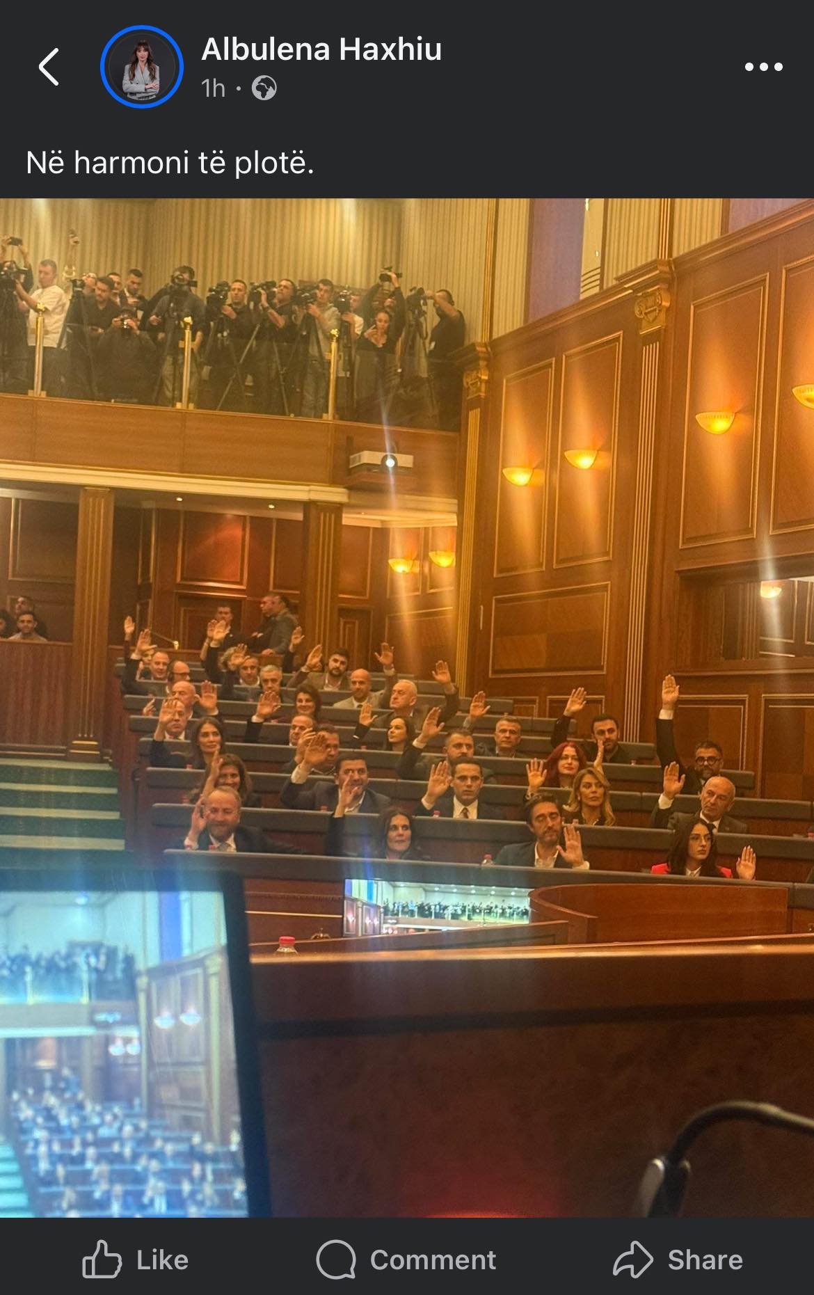 Nënkryetarja e Kuvendit të Kosovës, Albulena Haxhiu, ka publikuar një fotografi nga seanca, ku shihen deputetët e PDK-së dhe të Listës Serbe duke votuar kundër propozimit për ta mandatuar Glauk Konjufcën për formimin e qeverisë.