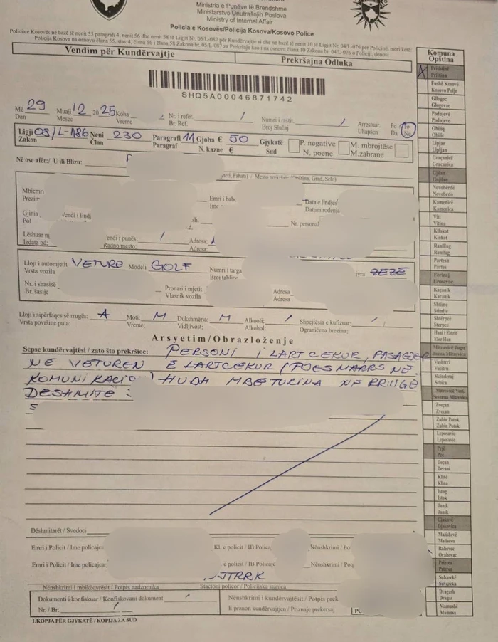 Prishtinë, 30 Dhjetor 2025– Njësiti i Trafikut të Kryeqytetit ka shqiptuar gjobë ndaj një personi, pasi i njëjti është hasur duke hedhur mbeturina nga vetura në rrugë.
