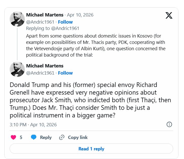 Gazetari Michael Martens, i cili prej kohësh ndjek zhvillimet në Ballkan, ka publikuar në platformën X disa nga pyetjet që i ka drejtuar Thaçit, raporton lajmi.net