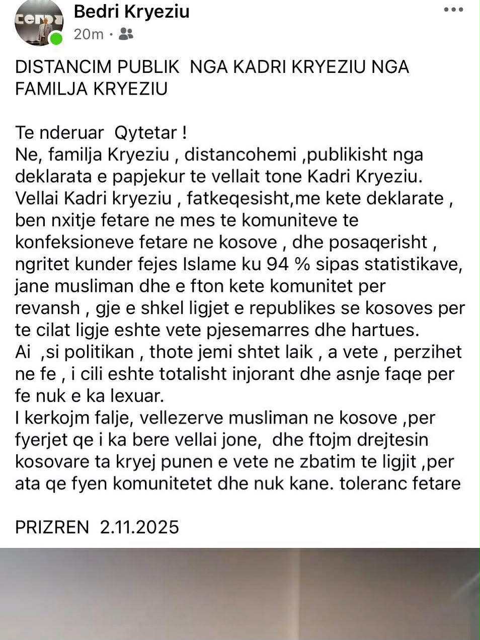 Bedri Kryeziu, në një postim në Facebook, ka thënë gjithashtu se vëllai i tij ka bërë nxitje fetare, ndërsa ka kërkuar që organet e drejtësisë të merren me rastin.