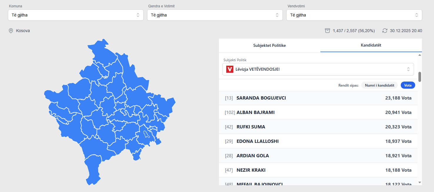 Në 10-shen e parë të deputetëve të VV-së me më së shumti vota, nga numërimi i 55.89% të kutive të votimit, janë Albin Kurti, Glauk Konjufca, Albulena Haxhiu, Hekuran Murati, Donika Gërvalla-Schwarz, Xhelal Sveçla, Hajrulla Çeko, Avni Dehari, Mimoza Kusari-Lila dhe Ejup Maqedonci.
