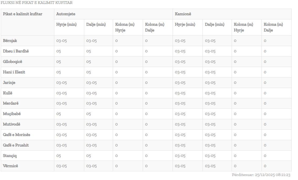 Janë përditësuar të dhënat nga Qendra Kombëtare për Menaxhim Kufitar lidhur me kolonat në pikat kufitare në Kosovë. Sipas të dhënave të fundit, pritjet për hyrje dhe dalje nga Kosova janë të shkurta. Raportohen pritje deri në 5 minuta në hyrje në, Bërnjak, Dheu i Bardhë, Glloboqicë, Stançiq, Mutivodë, Vërmicë, Han të Elezit, Jarinje, Kullë,…