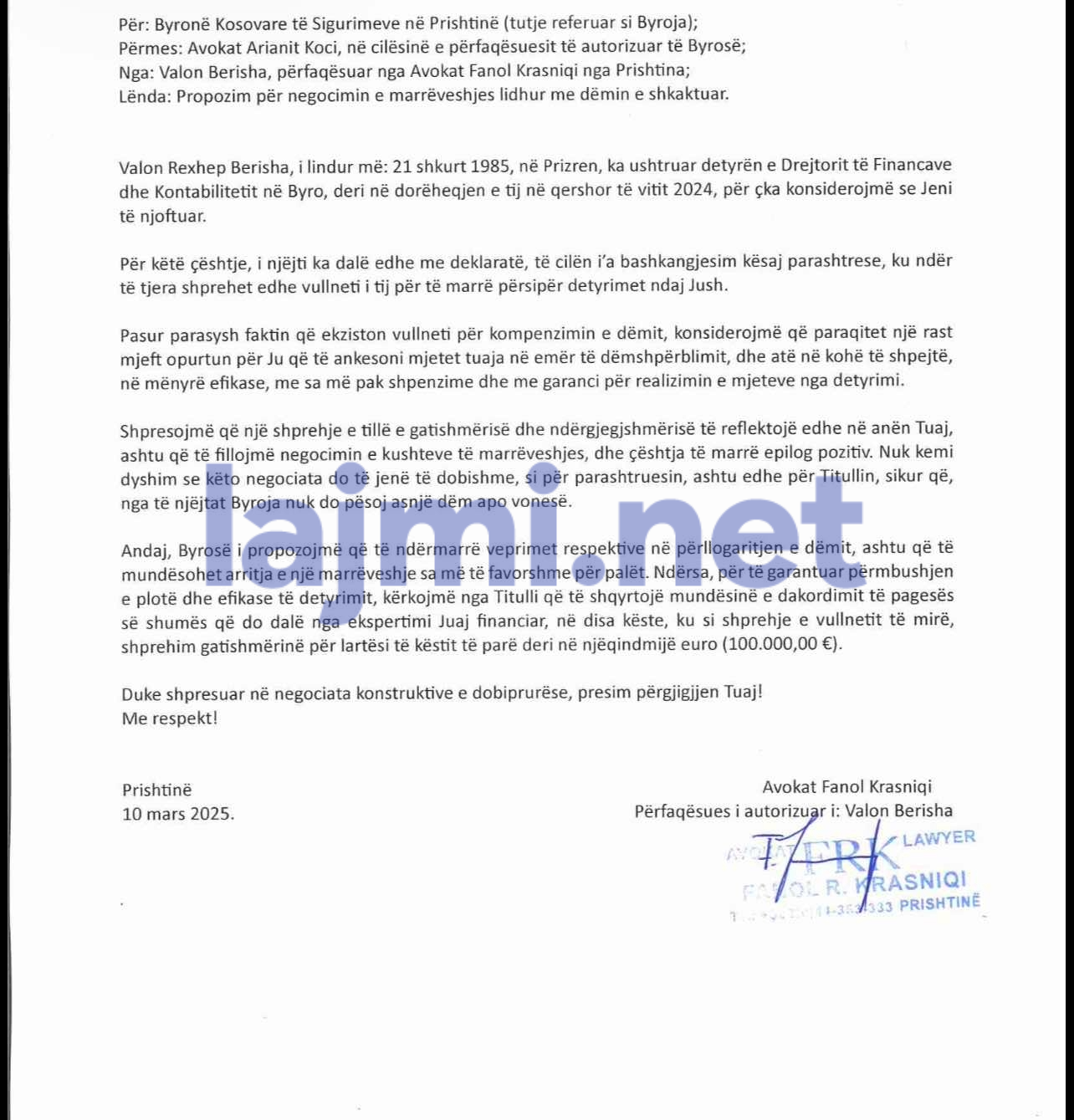 “Andaj, Byrosë i propozojmë që të ndërmarrë veprimet respektive në përllogaritjen e dëmit, ashtu që të mundësohet arritja e një marrëveshje sa më të favorshme për palët. Ndërsa, për të garantuar përmbushjen e plotë dhe efikase të detyrimit, kërkojmë që të shqyrtojë mundësinë e dakordimit të pagesës së shumës që do dalë nga ekspertimi Juaj financiar, në disa këste, ku si shprehje e vullnetit të mirë, shprehim gatishmërinë për lartësi të këstit të parë deri në njëqindmijë euro”, thuhet ndër të tjera në deklaratën e tij.