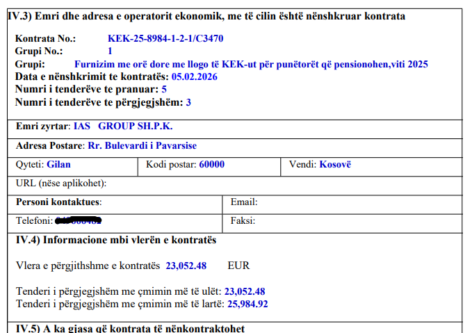 Pas përfundimit të procedurës së prokurimit, tenderi i është besuar operatorit ekonomik “IAS GROUP” SH.P.K.. Vlera përfundimtare e kontratës që do t’i kushtojë KEK-ut është 23,052.48 euro, që është më e ulët se shuma e paraparë fillimisht.