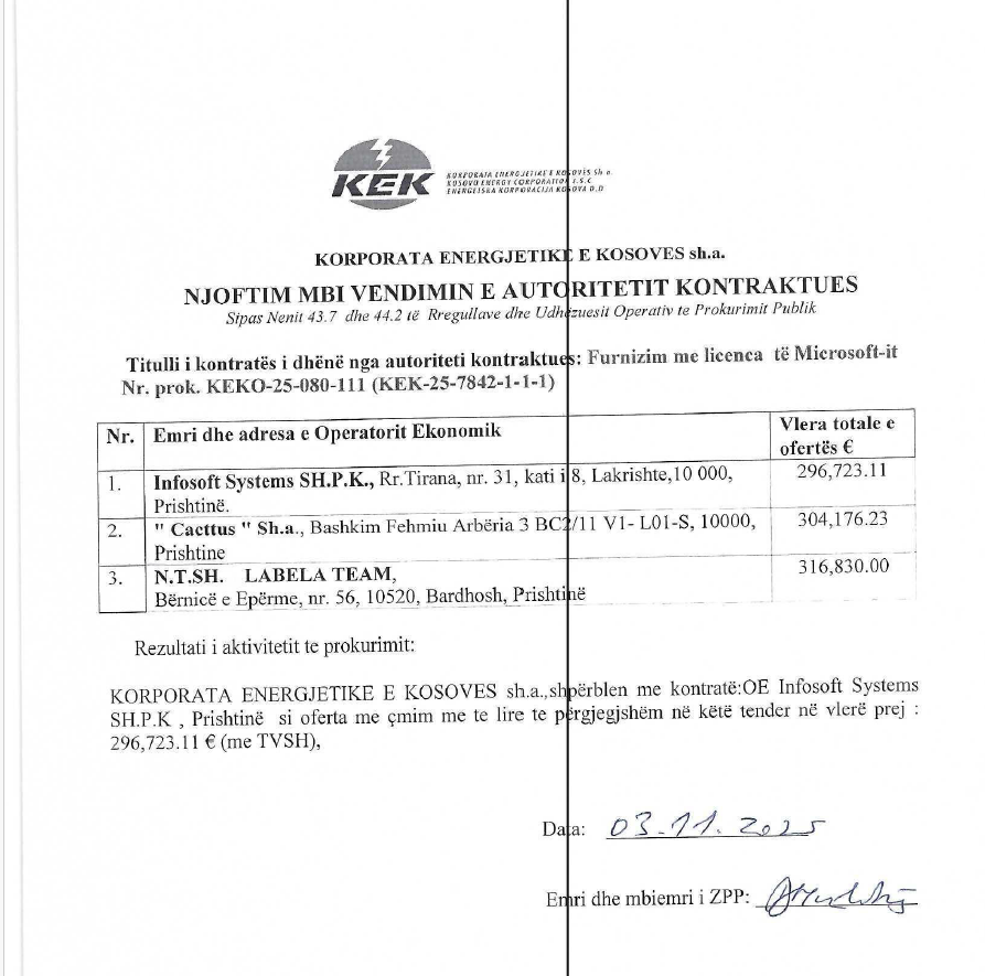 KEK, për furnizim me këto licenca, ka dhënë tender në vlerë prej 296 mijë e 723 euro e 11 centësh.