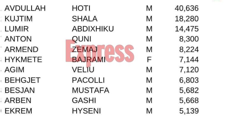 I 8-ti në këtë listë është Behgjet Pacolli me 6 mijë e 803, pastaj Besjan Mustaga me 5 mijë e 668 si dhe Arben Gashi me 5 mijë e 668.