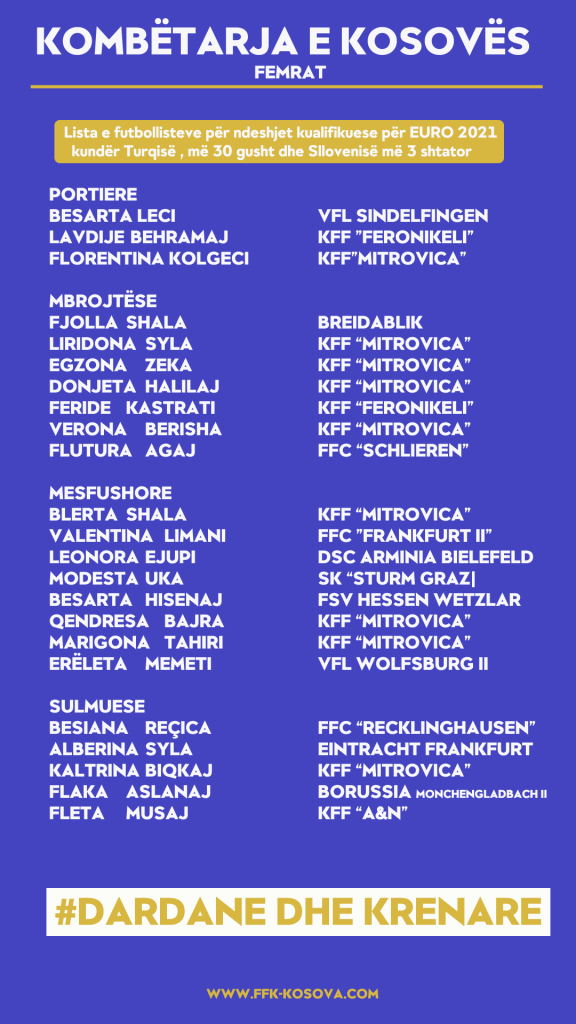 Përzgjedhësja e Kombëtares së Kosovës në konkurrencën e femrave, Afërditë Fazlija, e ka bërë publike listën e futbollisteve për dy ndeshjet e para kualifikuese për Euro 2021.