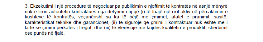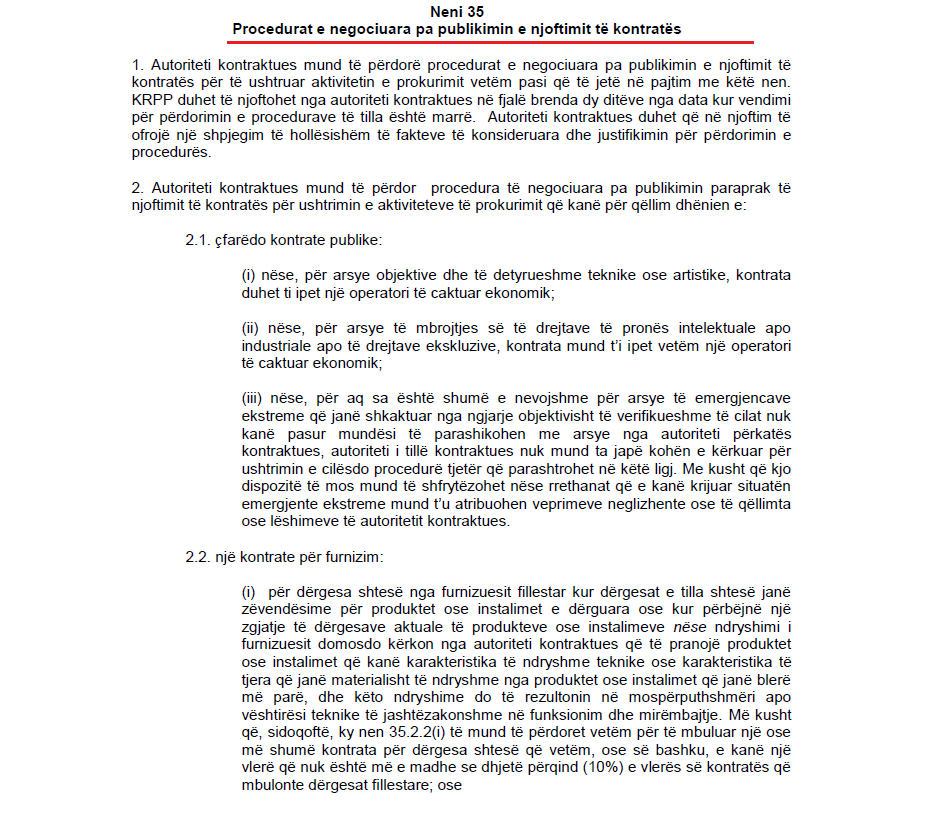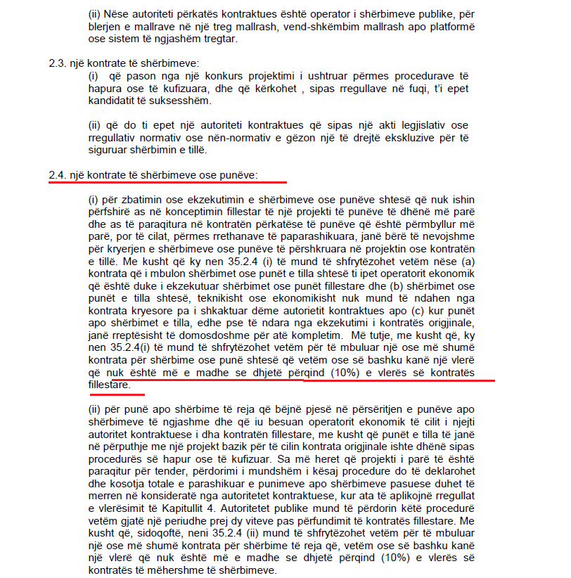 “Për punë apo shërbime të reja që bëjnë pjesë në përsëritjen e punëve apo shërbimeve të ngjashme dhe që iu besuan operatorit ekonomik të cilit i njëjti autoritet kontraktuese i dha kontratën fillestare, me kusht që punët e tilla të janë në përputhje me një projekt bazik për të cilin kontrata origjinale ishte dhënë sipas procedurës së hapur ose të kufizuar. Sa më herët që projekti i parë të është paraqitur për tender, përdorimi i mundshëm i kësaj procedure do të deklarohet dhe kosotja totale e parashikuar e punimeve apo shërbimeve pasuese duhet të merren në konsideratë nga autoritetet kontraktuese, kur ata të aplikojnë rregullat e vlerësimit të Kapitullit 4. Autoritetet publike mund të përdorin këtë procedurë vetëm gjatë një periudhe prej dy viteve pas përfundimit të kontratës fillestare. Me kusht që, sidoqoftë, neni 35.2.4 (ii) mund të shfrytëzohet vetëm për të mbuluar një ose më shumë kontrata për shërbime të reja që, vetëm ose së bashku kanë një vlerë që nuk është më e madhe se dhjetë për qind (10%) e vlerës së kontratës të mëhershme të shërbimeve”, thuhet në nenin 35 të LPP-së.