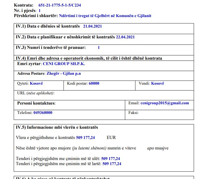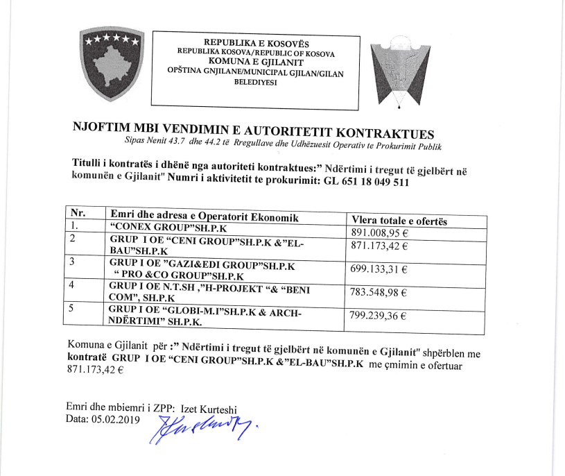 Për këtë projekt, prokurimi i Gjilanit me 05.02.2019 e kishte shpall fitues konzerciumin “Ceni Group” shpk & “El Bau” shpk ne një vlerë të kontratës prej 871. 173, 42 euro.