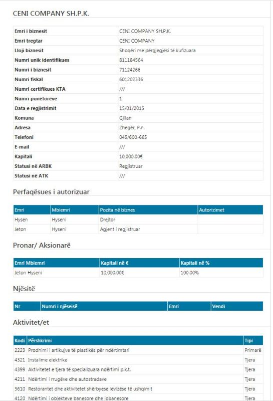 Pronar në kompanisë “Ceni Company” shpk është Jeton Hyseni, kurse drejtor babai i tij, Hysen Hyseni.