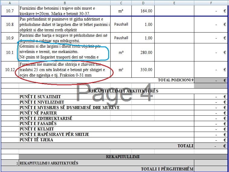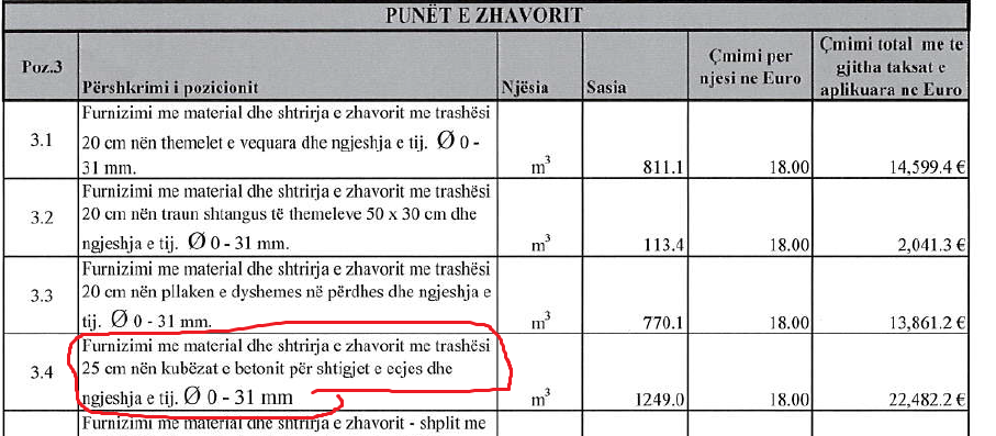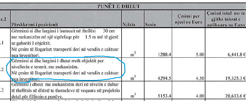 Po ashtu, në paramasën e re, sigurohet: “Gërmimi dhe largimi i dheut rreth objektit për nivelimin e terenit, me mekanizëm. Në çmim përllogaritet transporti” në sasi prej 280.00 m2. Në paramasën e vitit 2019 ishte paraparë edhe ky pozicion që ishte në sasi prej 4294.5 m3.