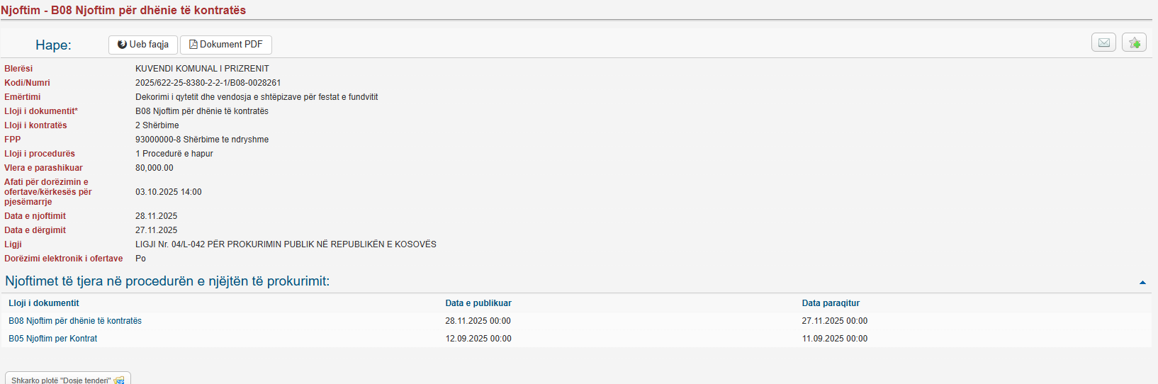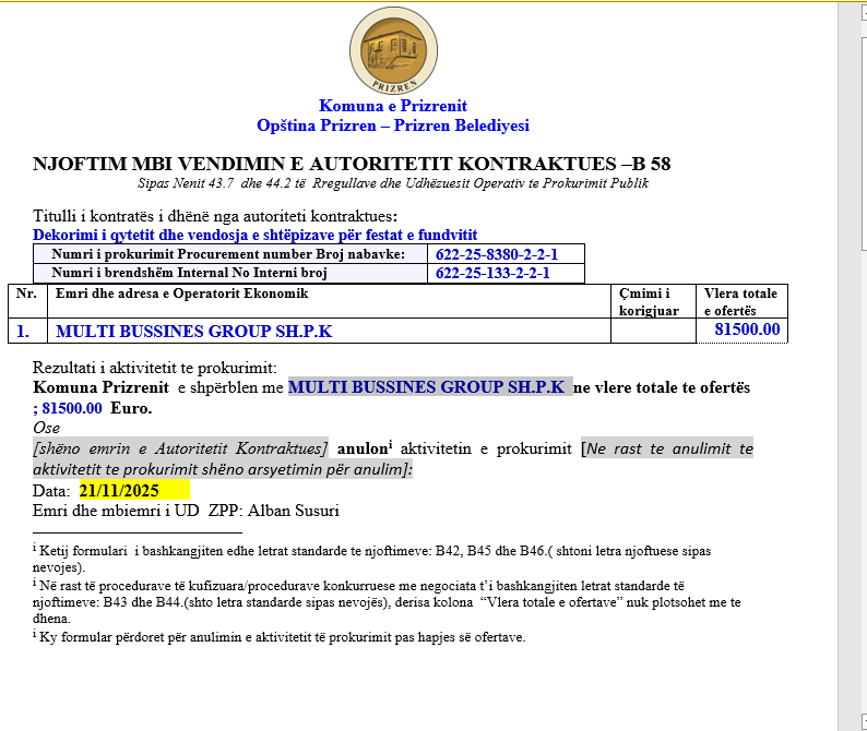 Tenderi fillimisht ishte hapur në vlerë prej 80 mijë eurove, por që kompania me ofertën më të lirë, e cila edhe e ka fituar këtë tender “MULTI BUSSINES GROUP SH.P.K”, ka ofertuar me 81 mijë e 500 euro.