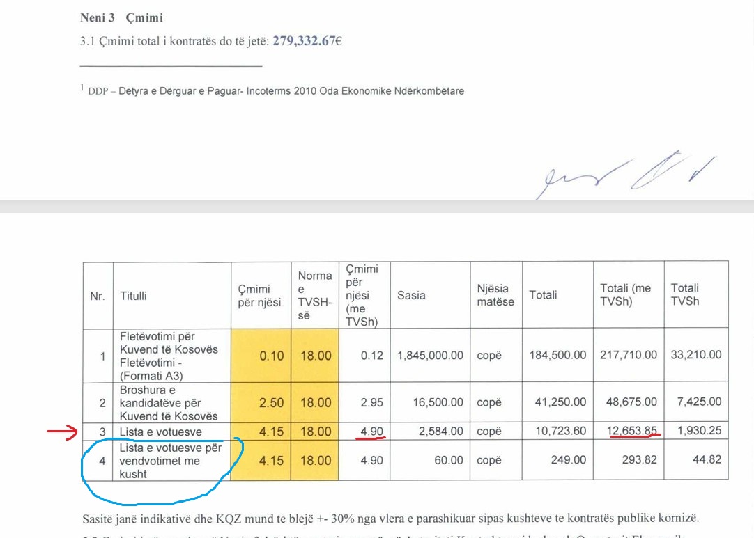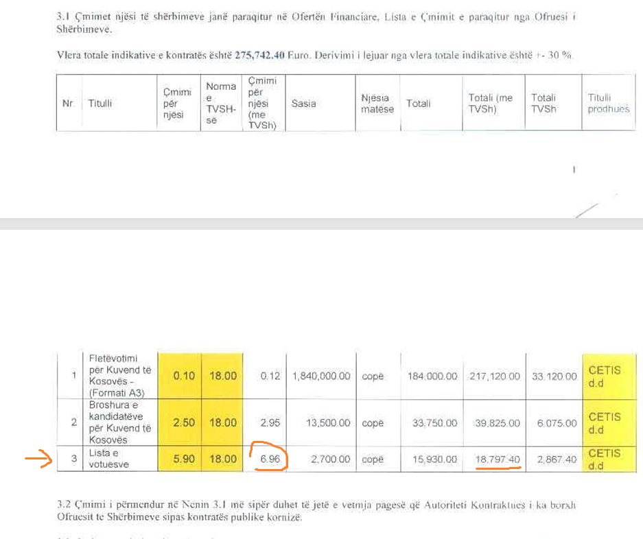 Paralelisht me këtë, kontrata e 28 dhjetorit shfaq edhe rritje të ndjeshme të çmimeve për njësi. Çmimi i “Listës së votuesve” është rritur nga 4.15 euro në 5.90 euro për copë, një rritje prej rreth 42 për qind, ndonëse bëhet fjalë për të njëjtën kompani, të njëjtën procedurë të negociuar dhe vetëm rreth dhjetë muaj diferencë mes dy kontratave.