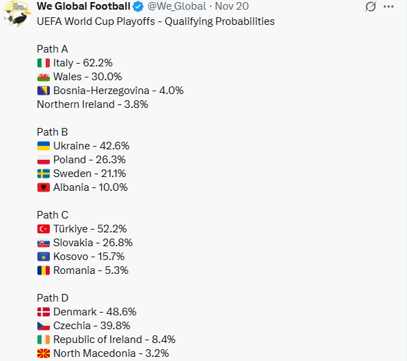 “We Global Football” ka bërë parashikimet për skuadrat që do të luajnë në play off-in e Botërorit.